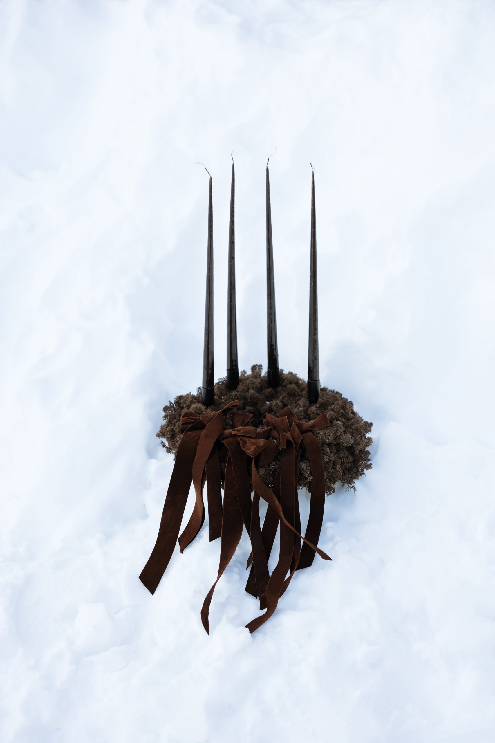 Adventski vijenac ESPRESSO MOSS ručno je izrađen od islandske mahovine uz dodatak premium lakiranih svijeća danskog brenda ester&erik i smeđih baršunastih mašni.